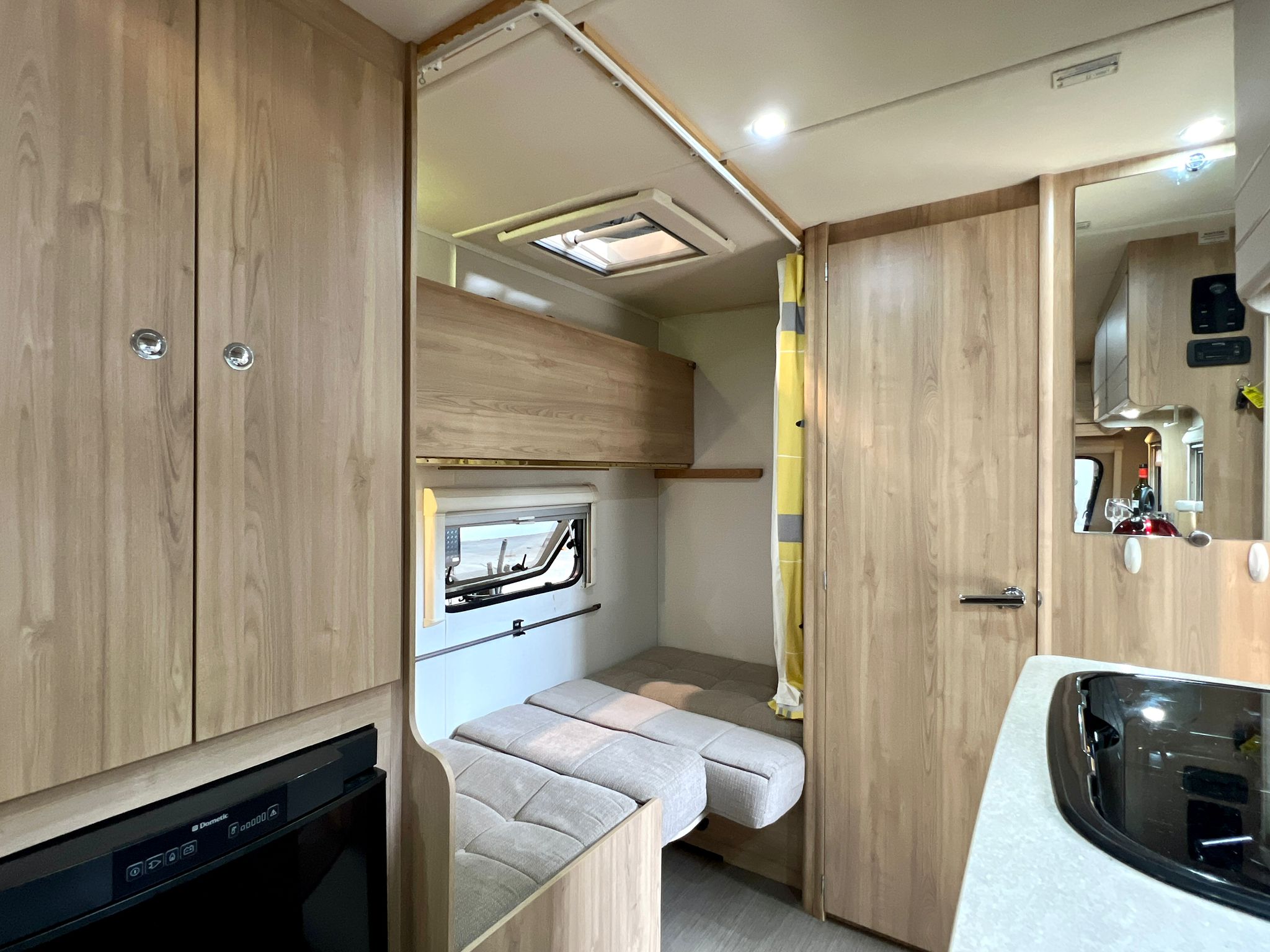 - Front L-shaped lounge / club lounge converts to a large double bed with pull-out slats or single beds / daybeds.