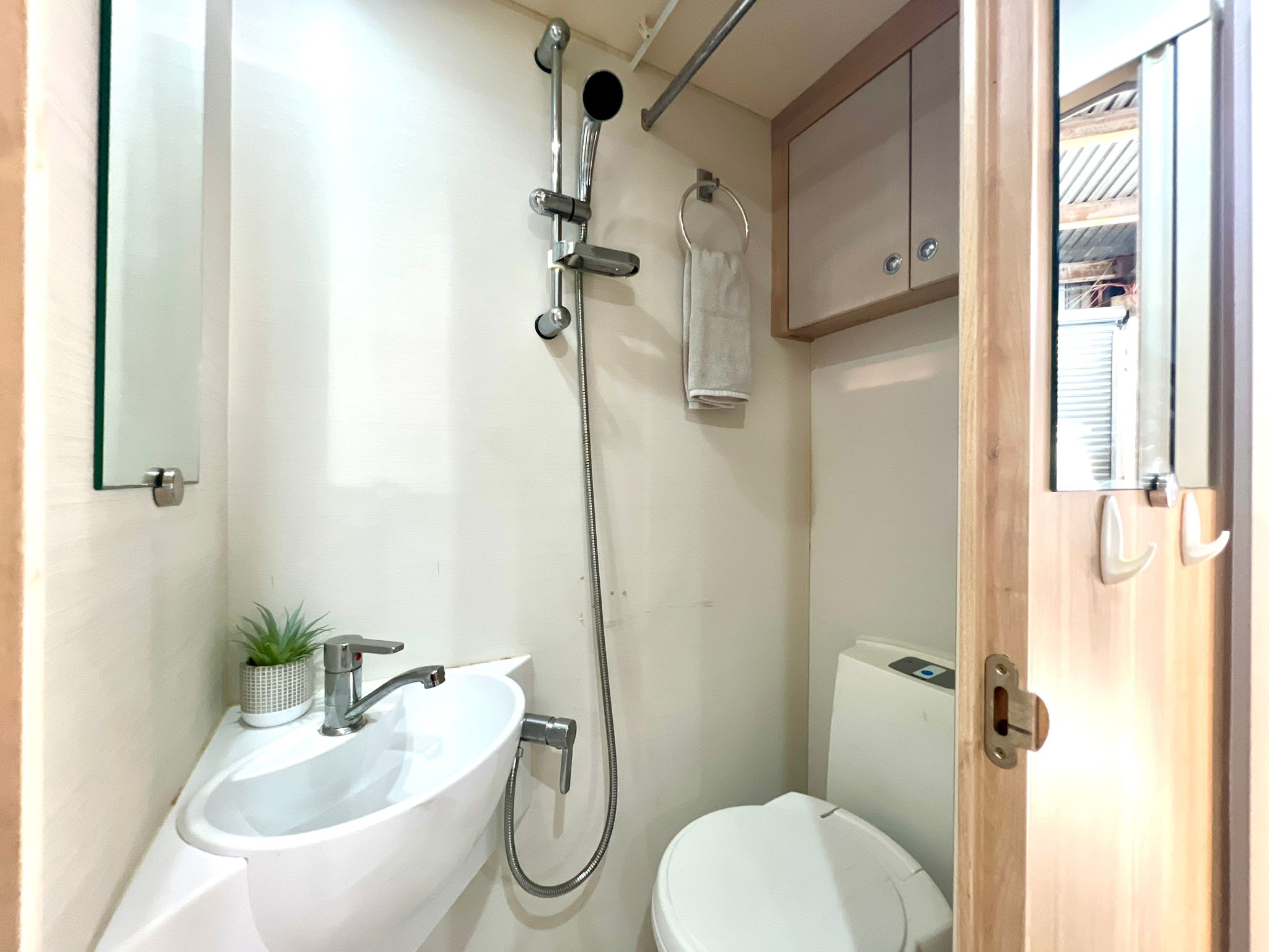 - End bathroom with shower, full swivel toilet + vanity