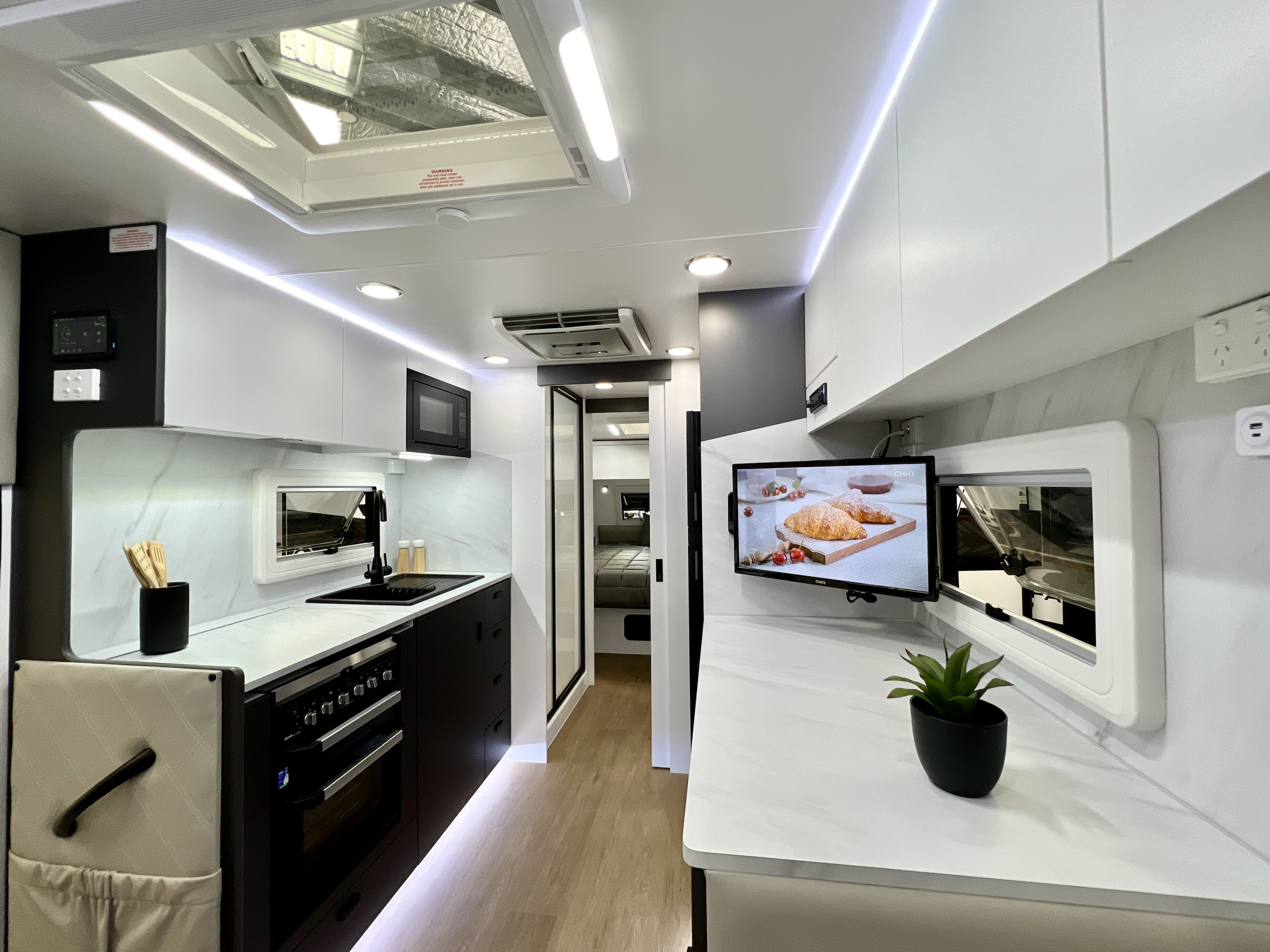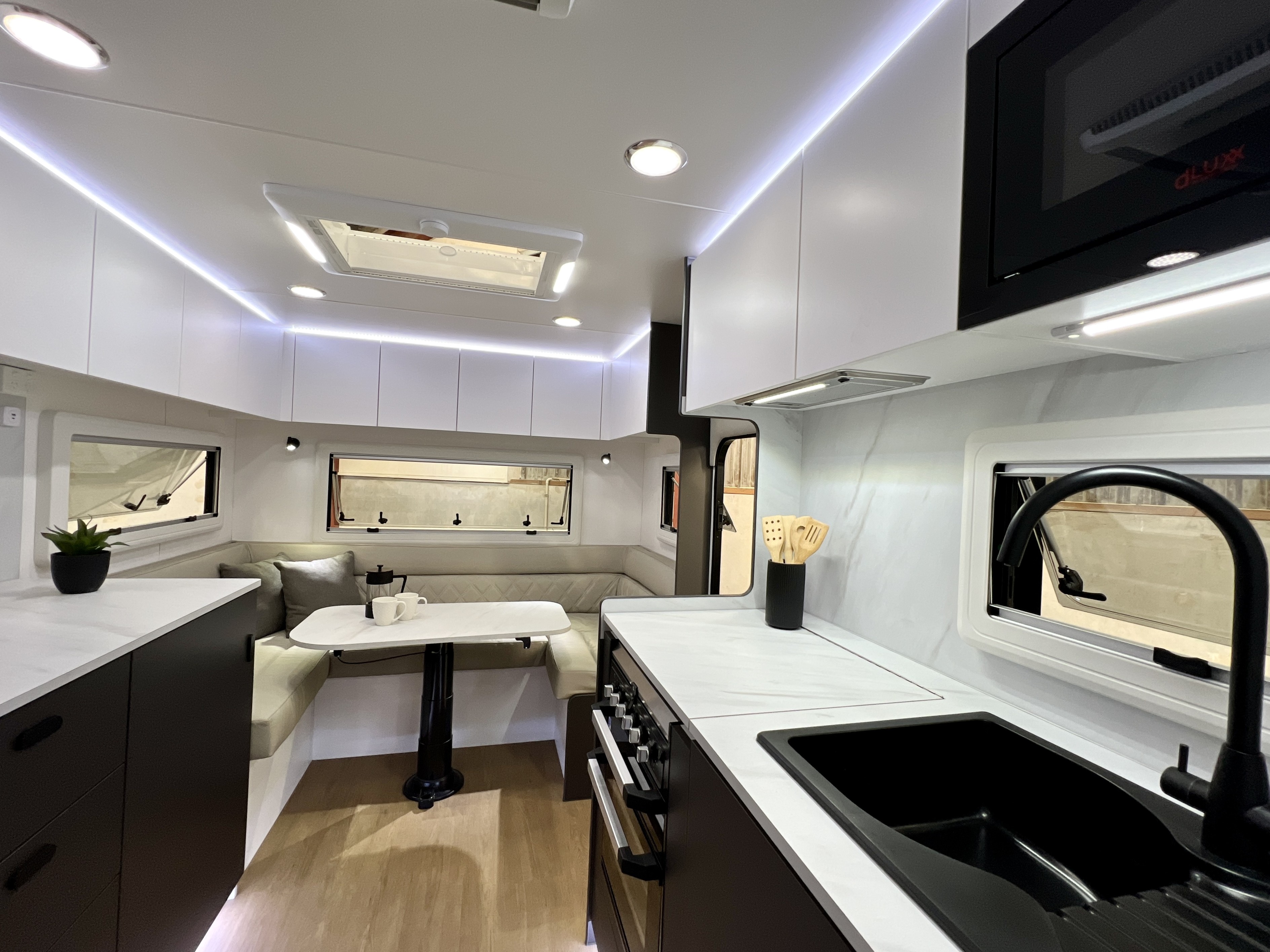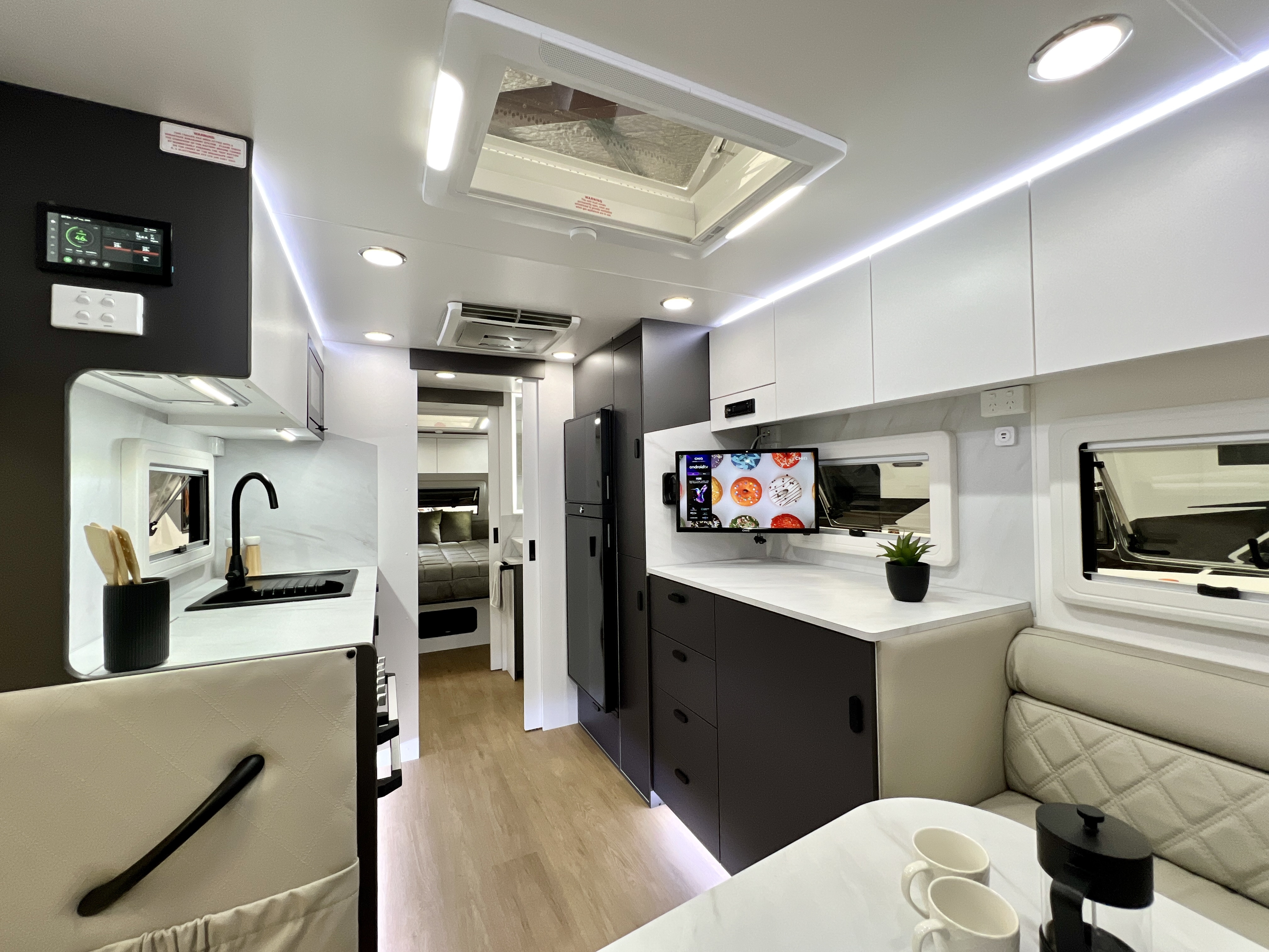 This layout is a sure winner for caravanning in utmost style and comfort. With the plush rear club lounge, full central ensuite bathroom and front bedroom, this is a 5-star hotel on wheels.