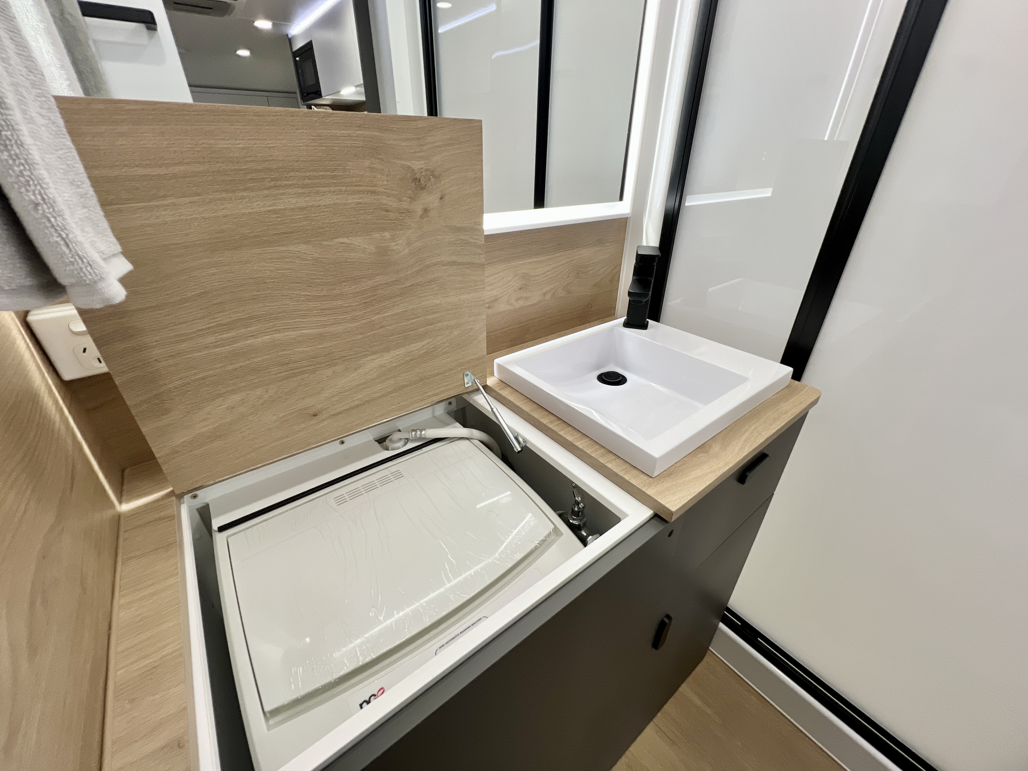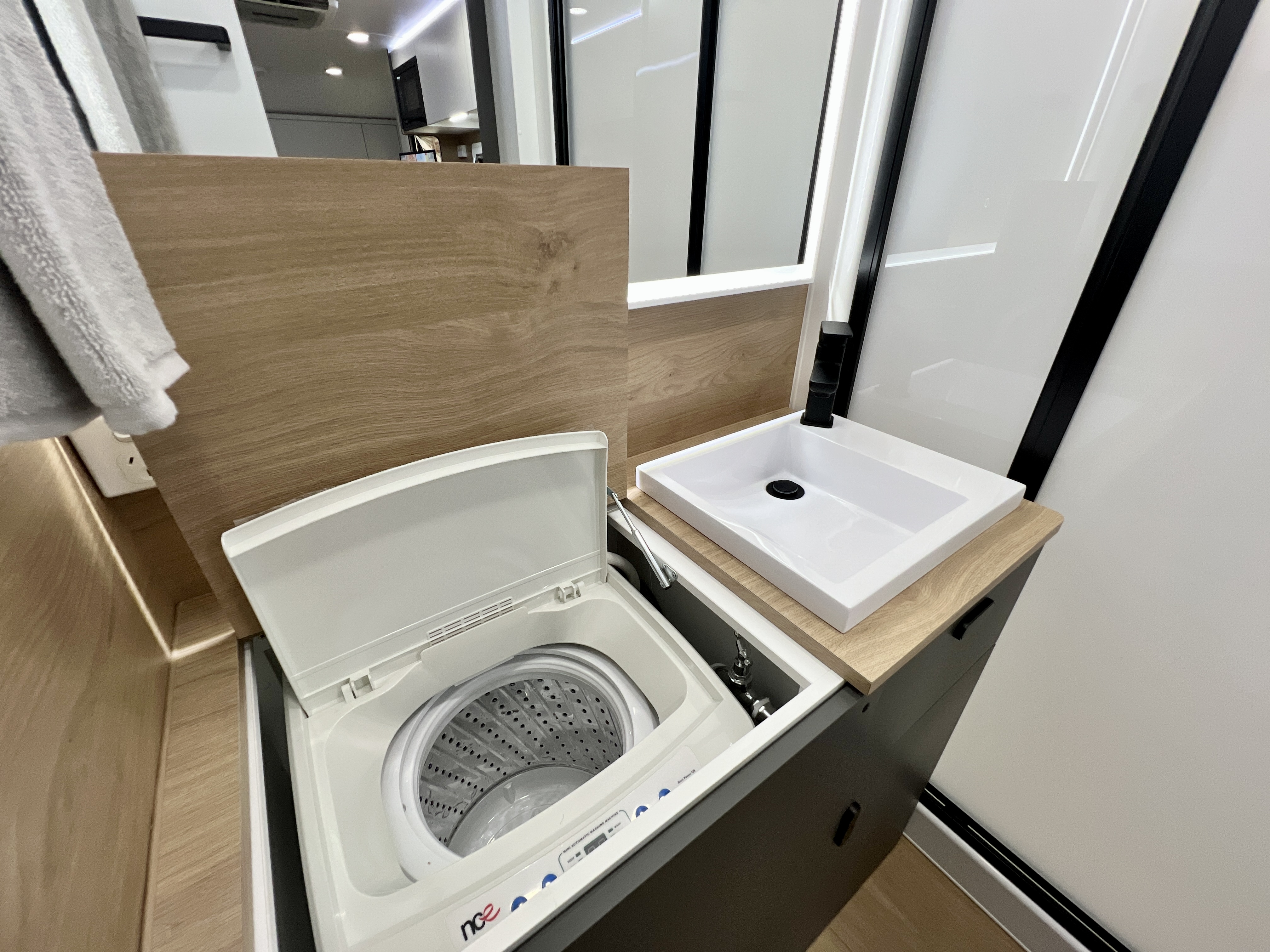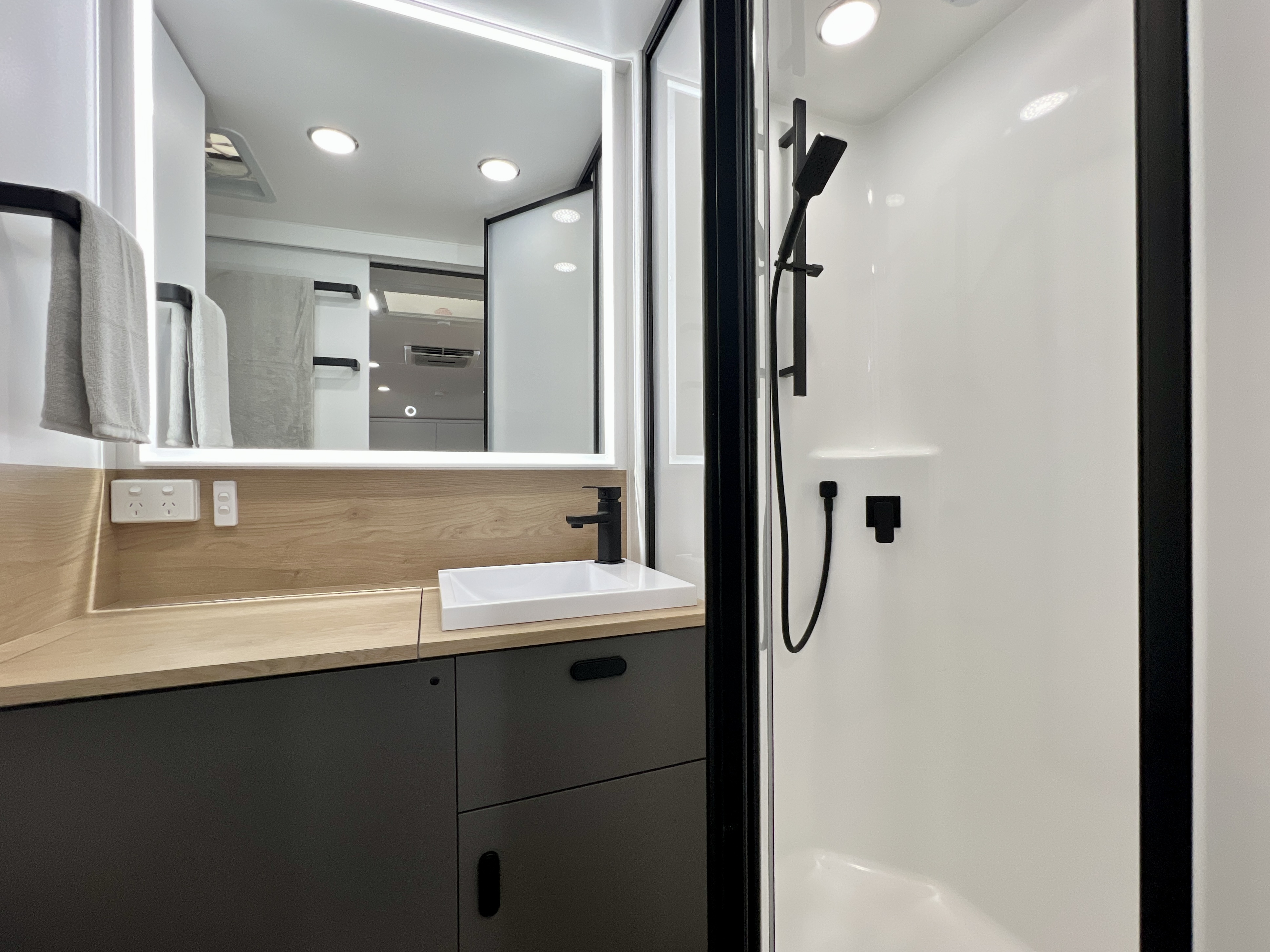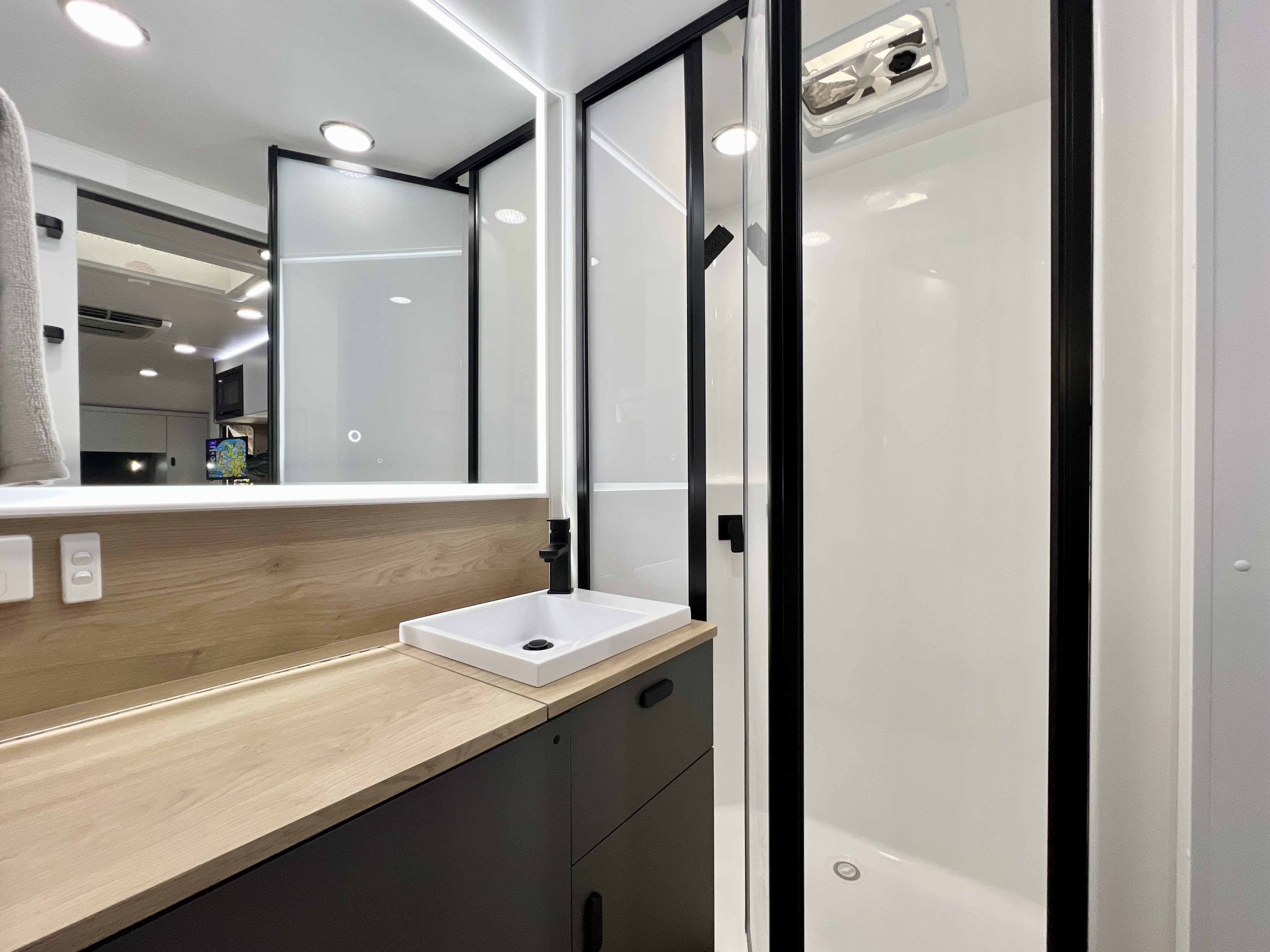 - Fully enclosed, full-height shower with waterproof ceiling