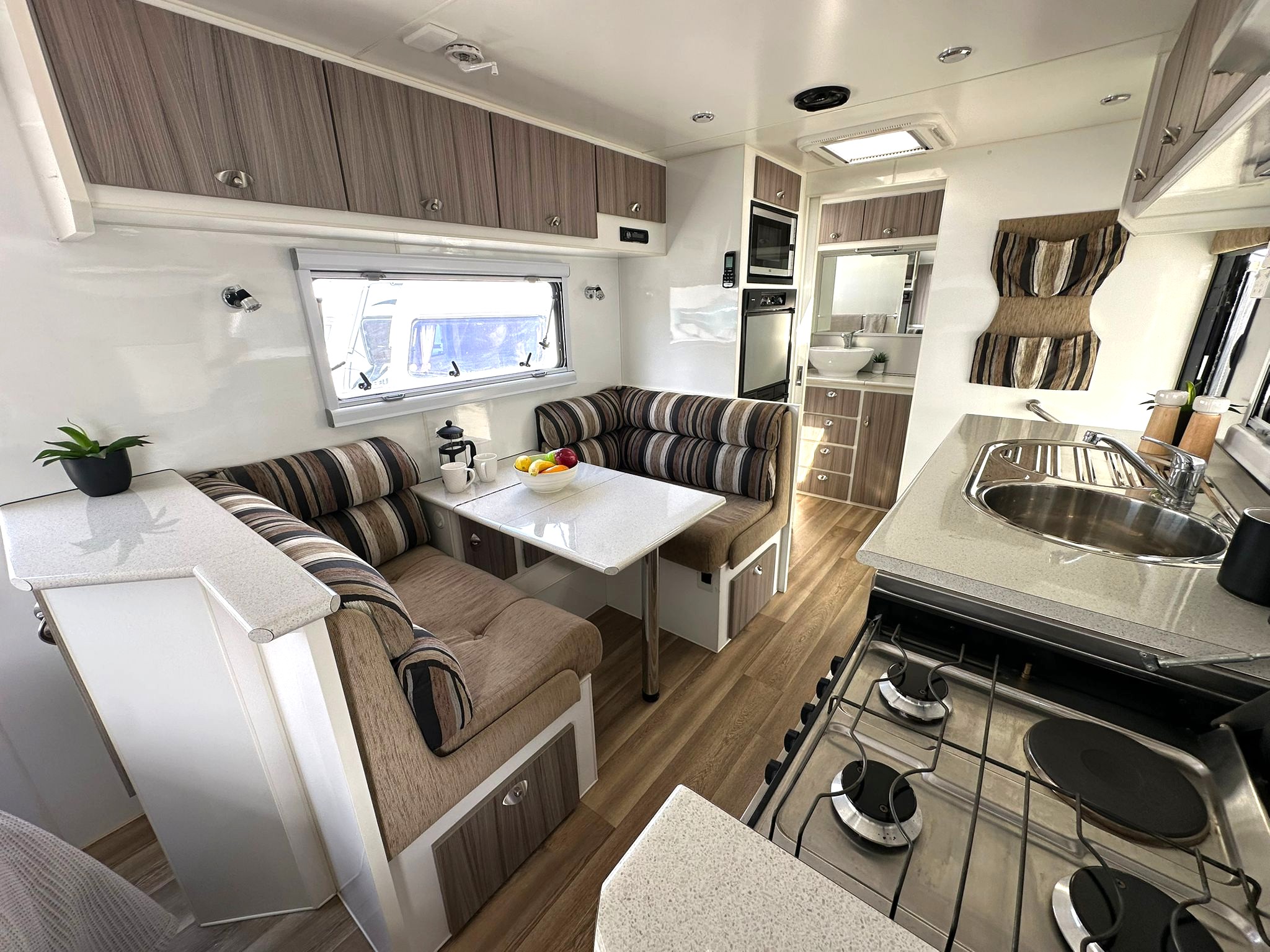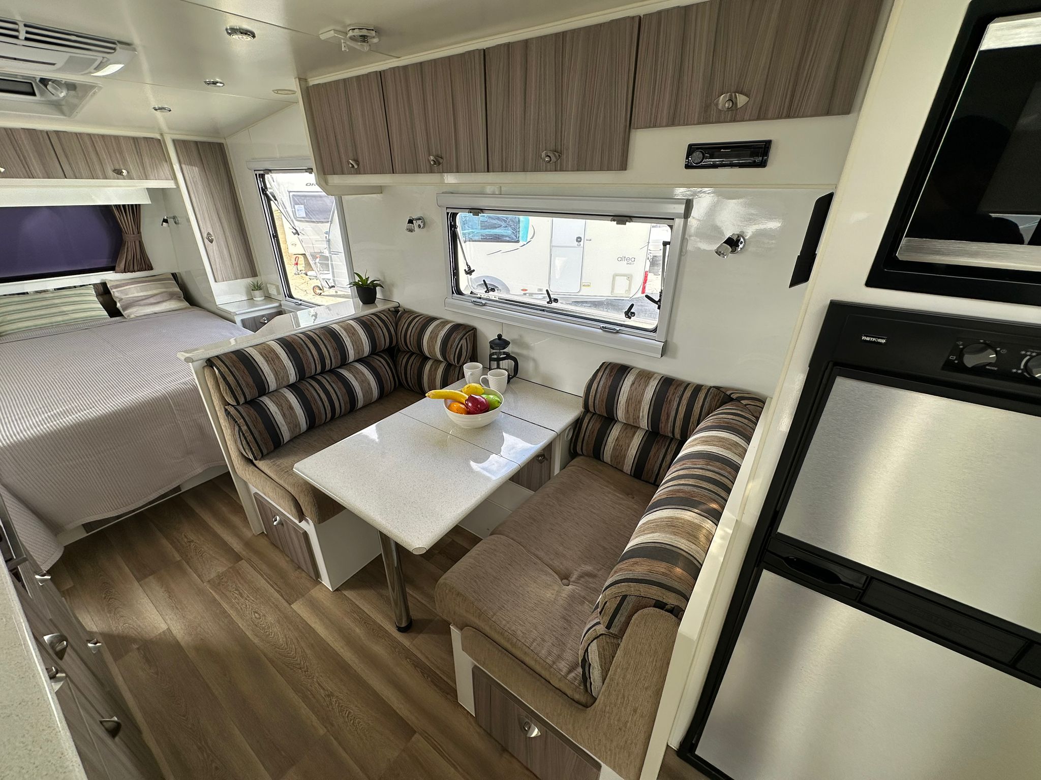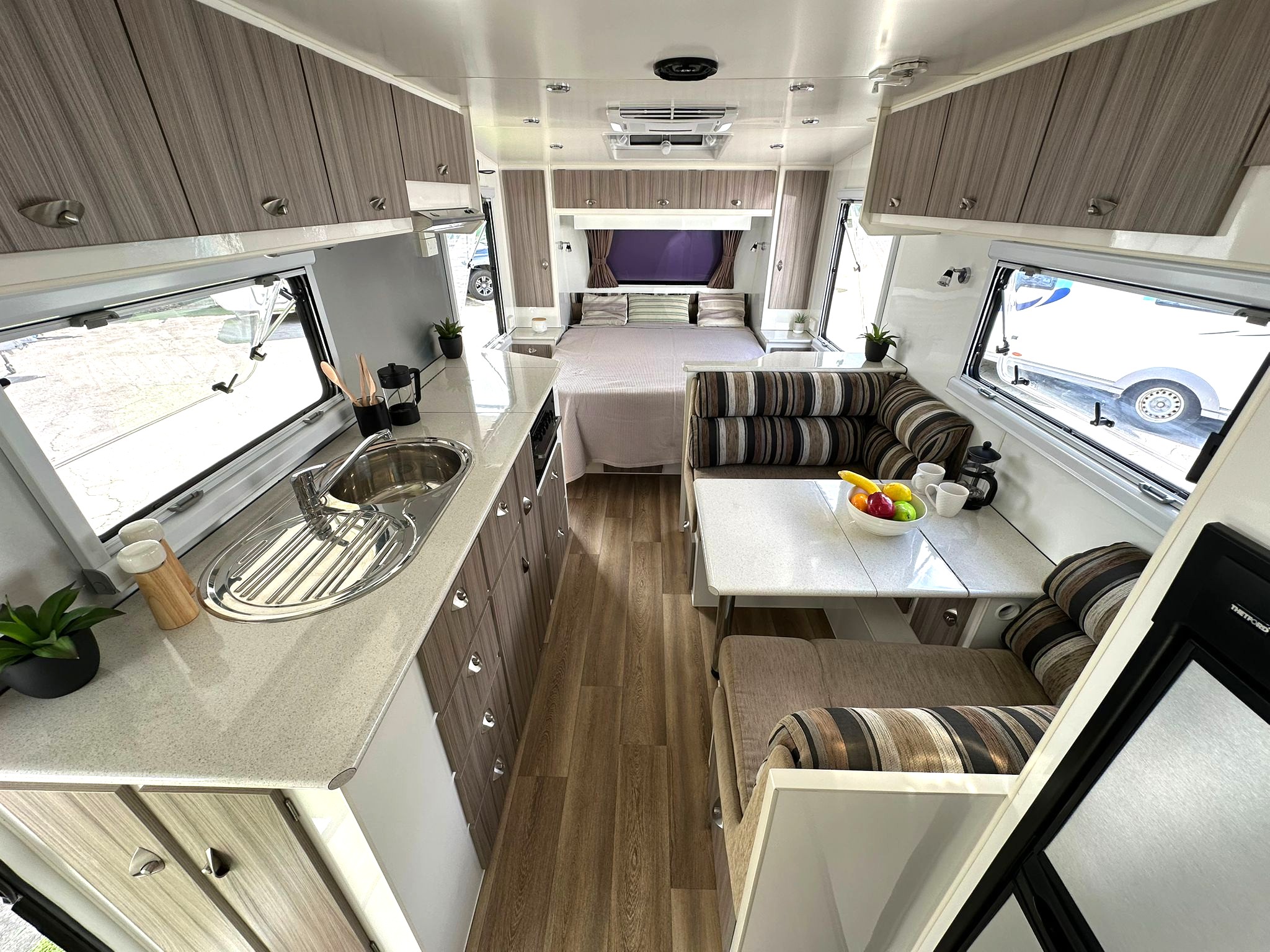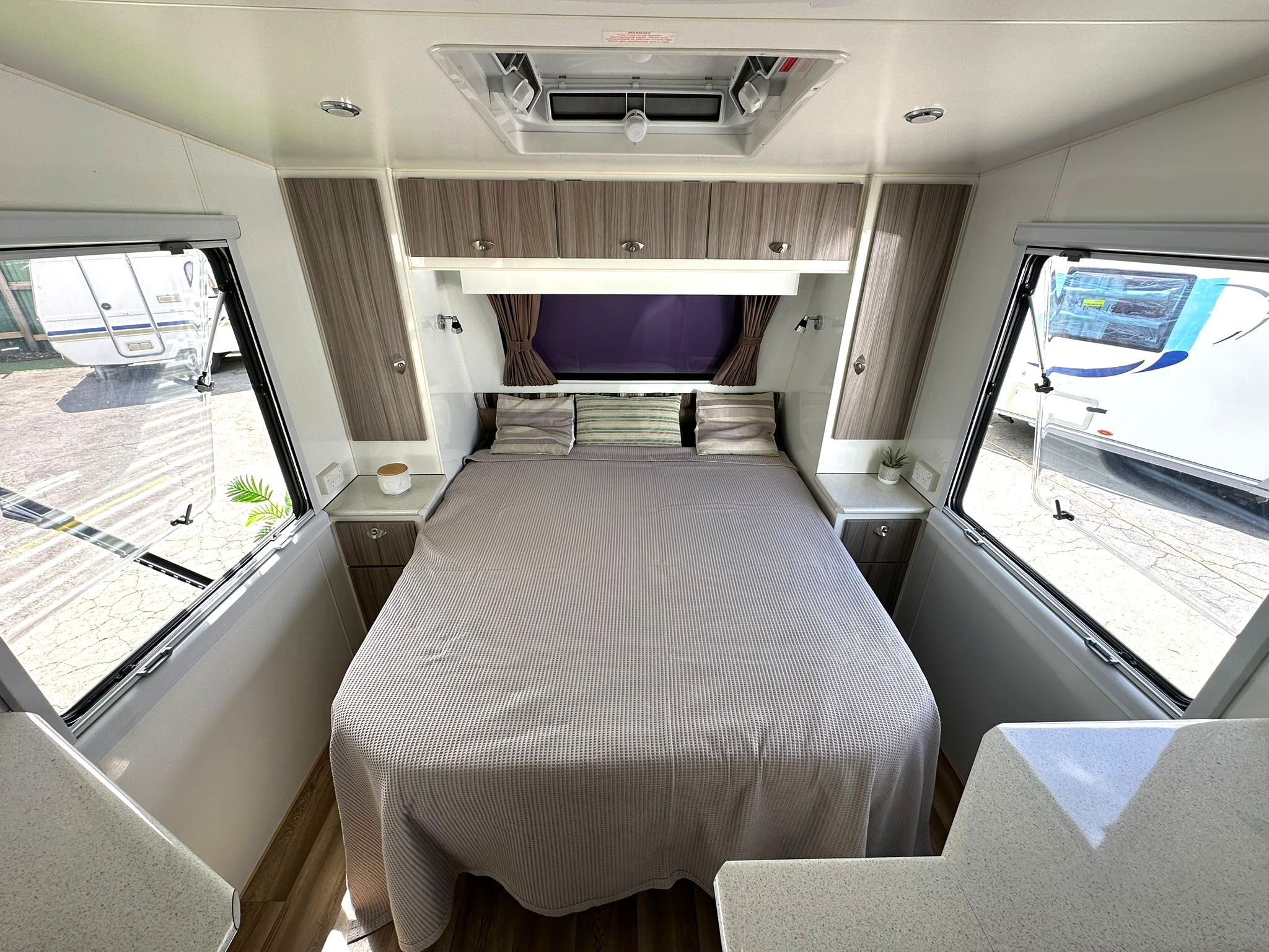 This Explorer model has the very popular spacious couple’s layout with Queen island bed in the front, central kitchen + dinette and full rear ensuite. A fantastic van in this price range.