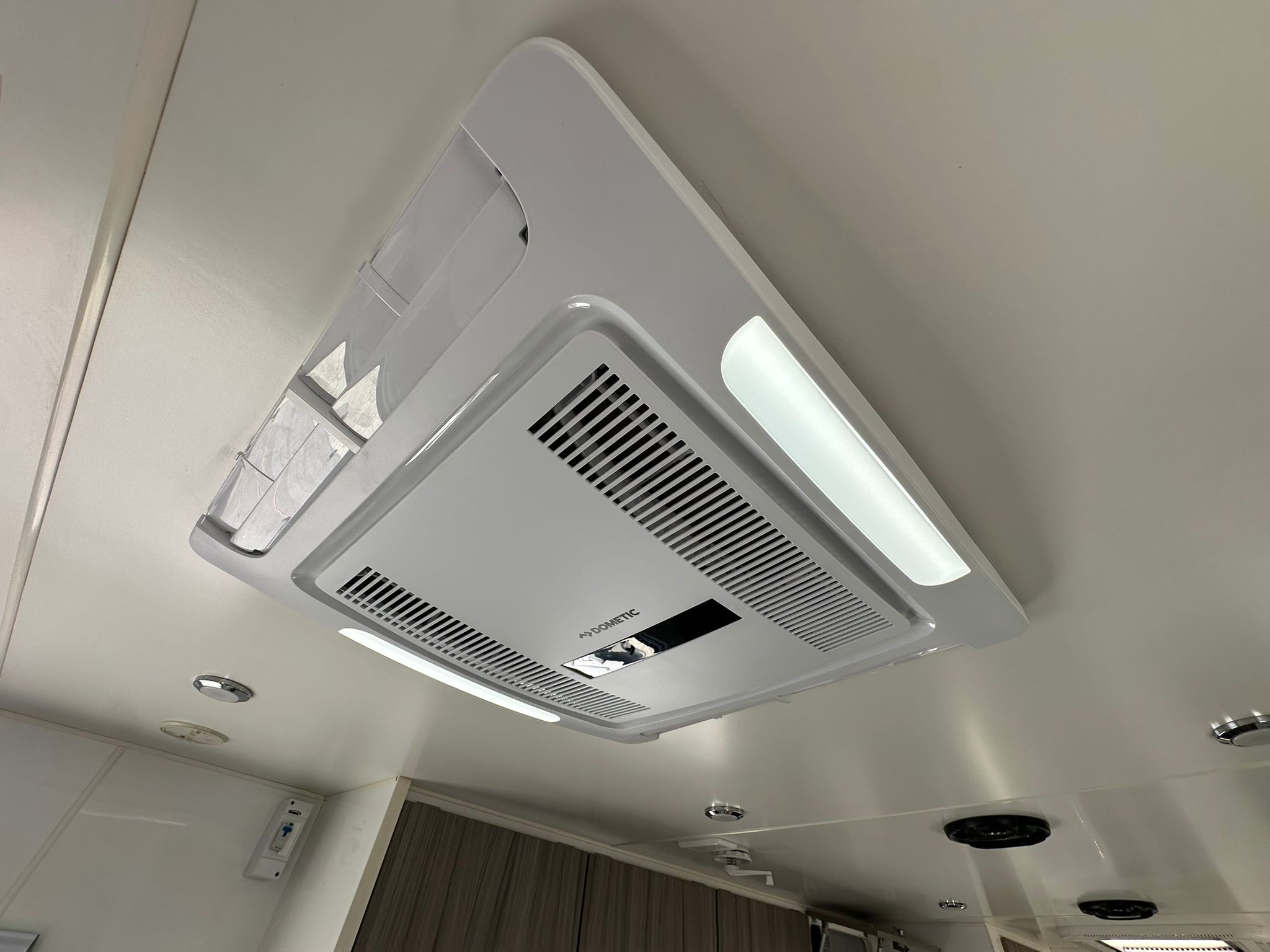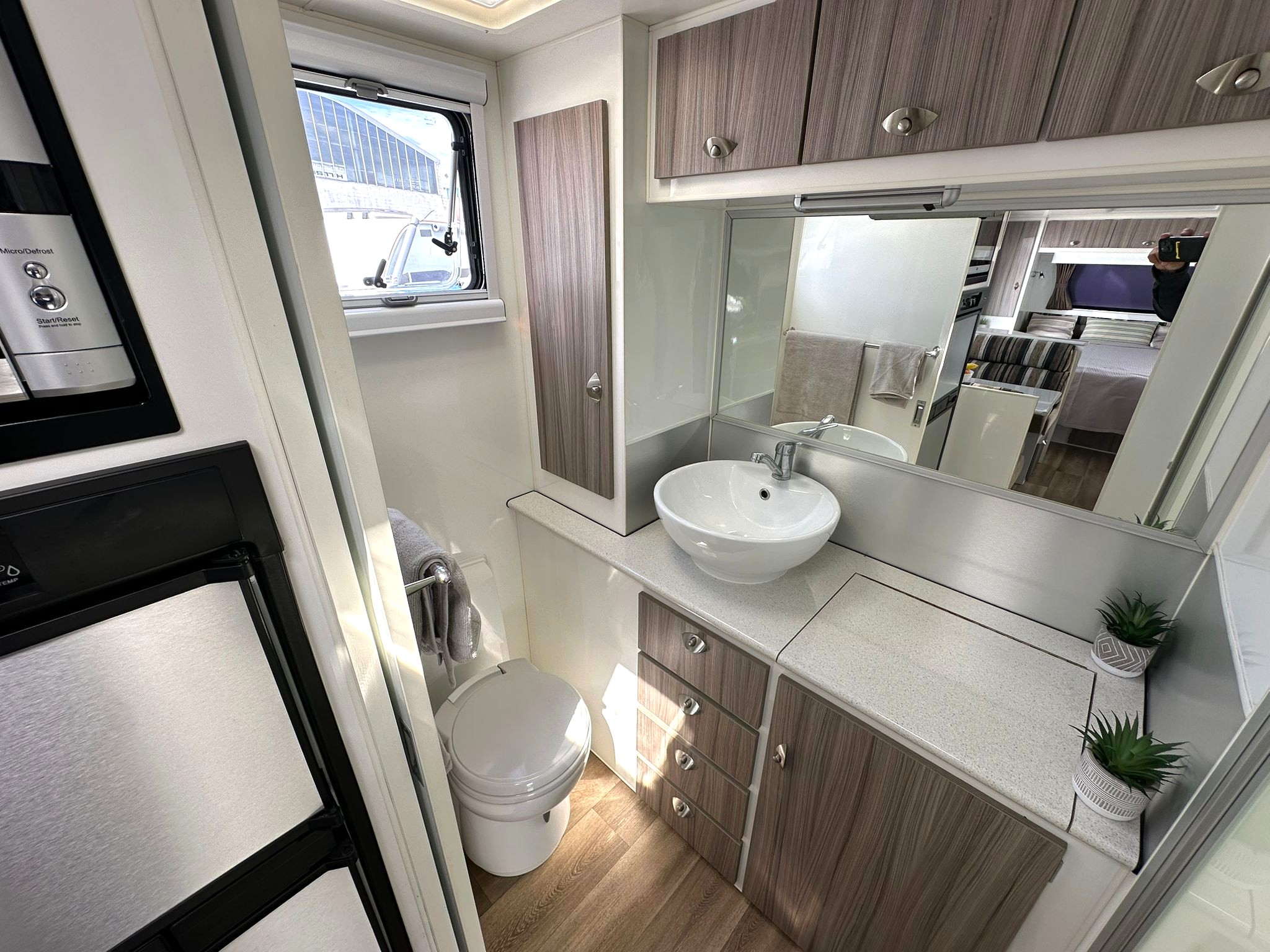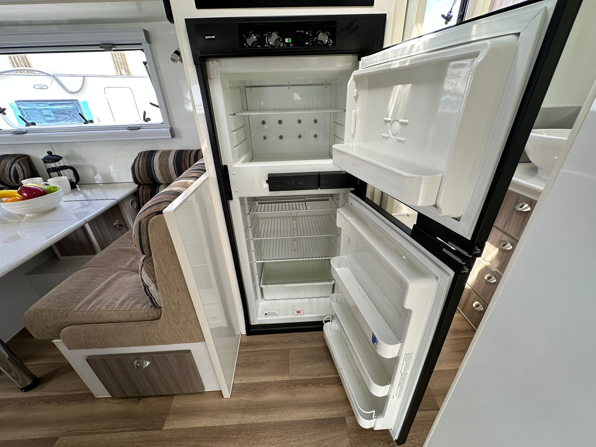 This Explorer model has the very popular spacious couple’s layout with Queen island bed in the front, central kitchen + dinette and full rear ensuite. A fantastic van in this price range.