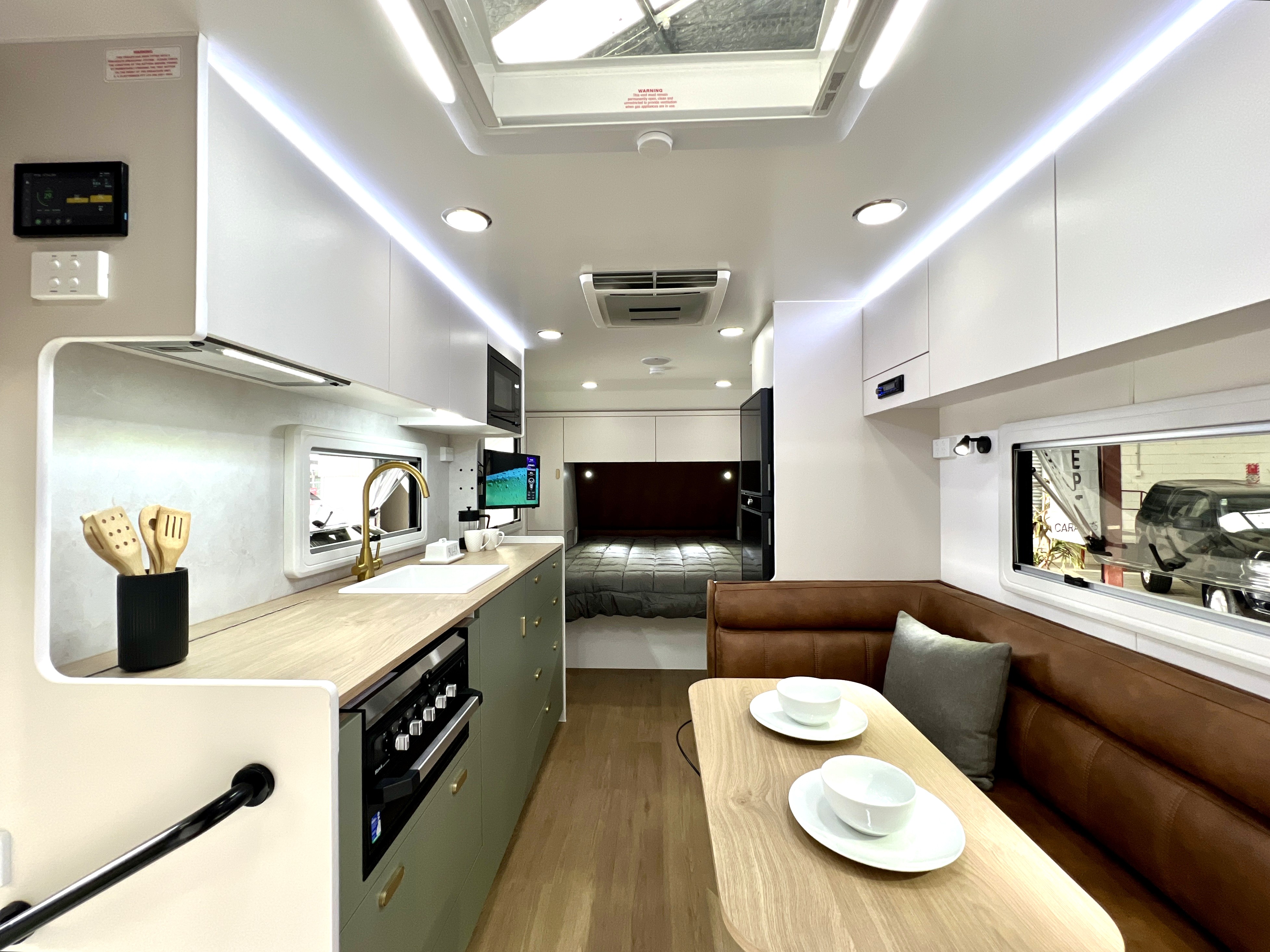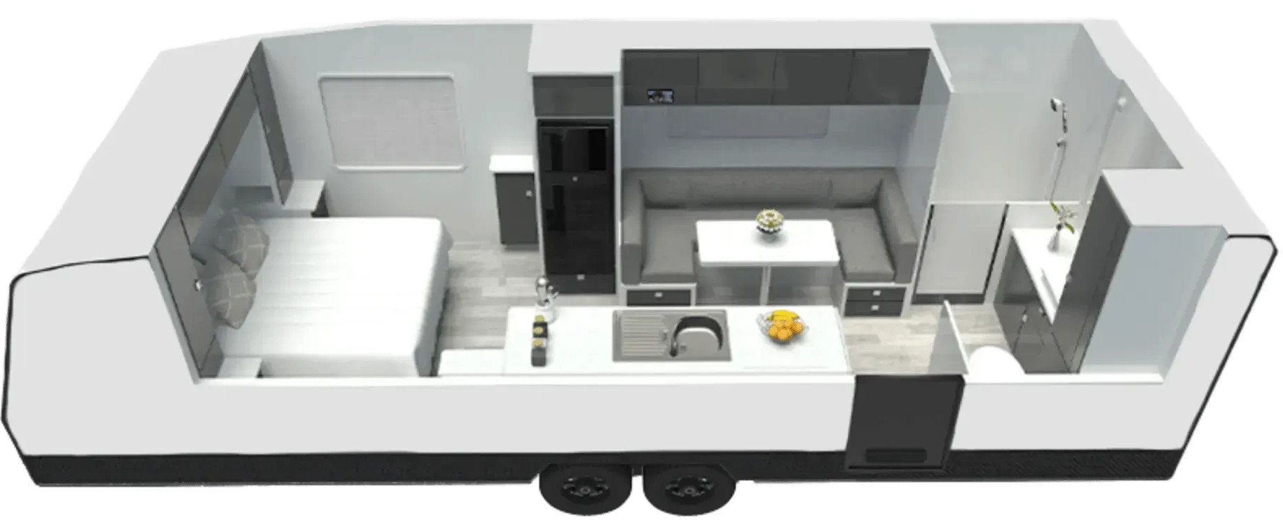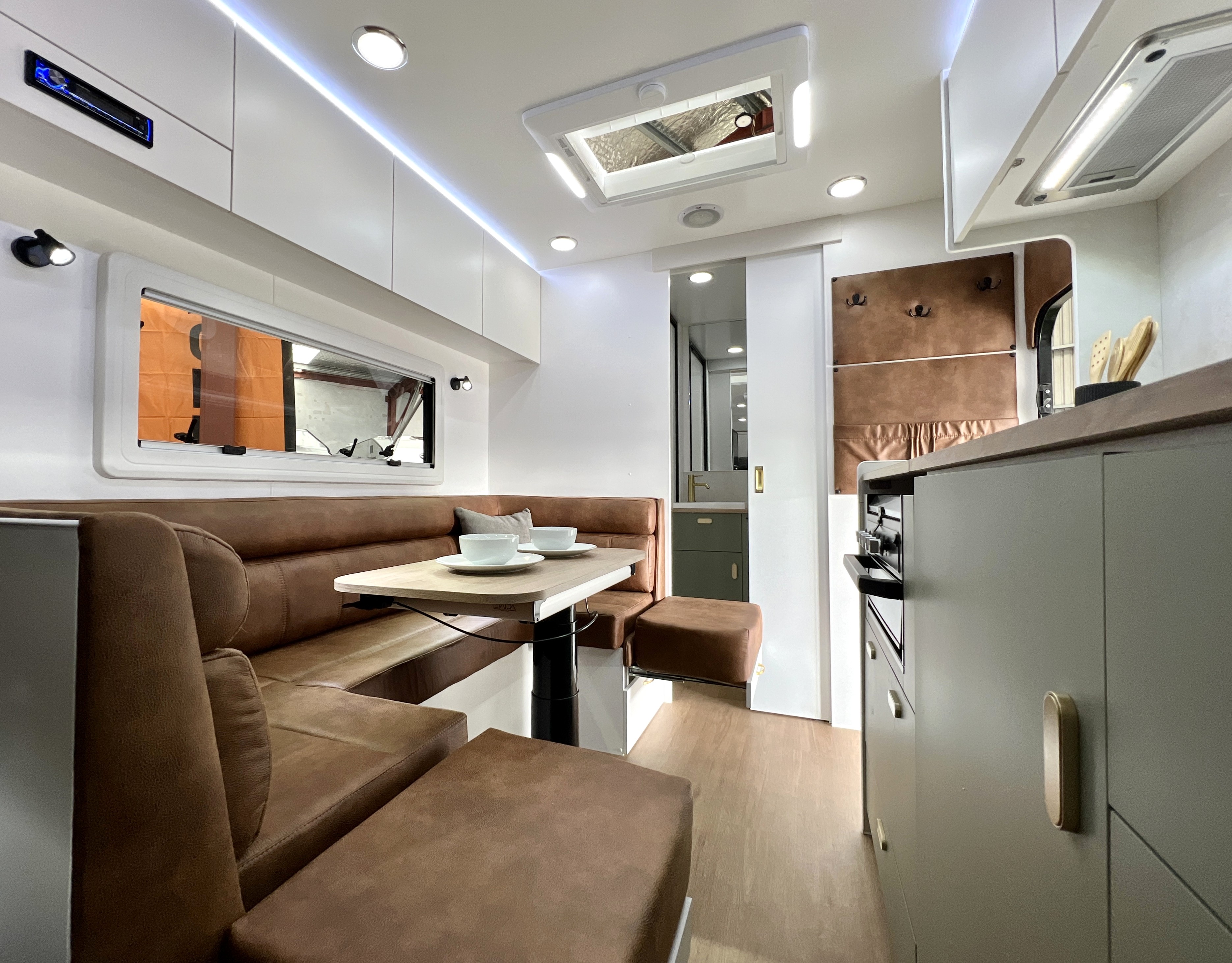 This brilliant, spacious 20’6″ model’s layout features the front Queen Island bed, full rear ensuite and central club lounge opposite the kitchen. A telescopic dining table drops down to make another berth.