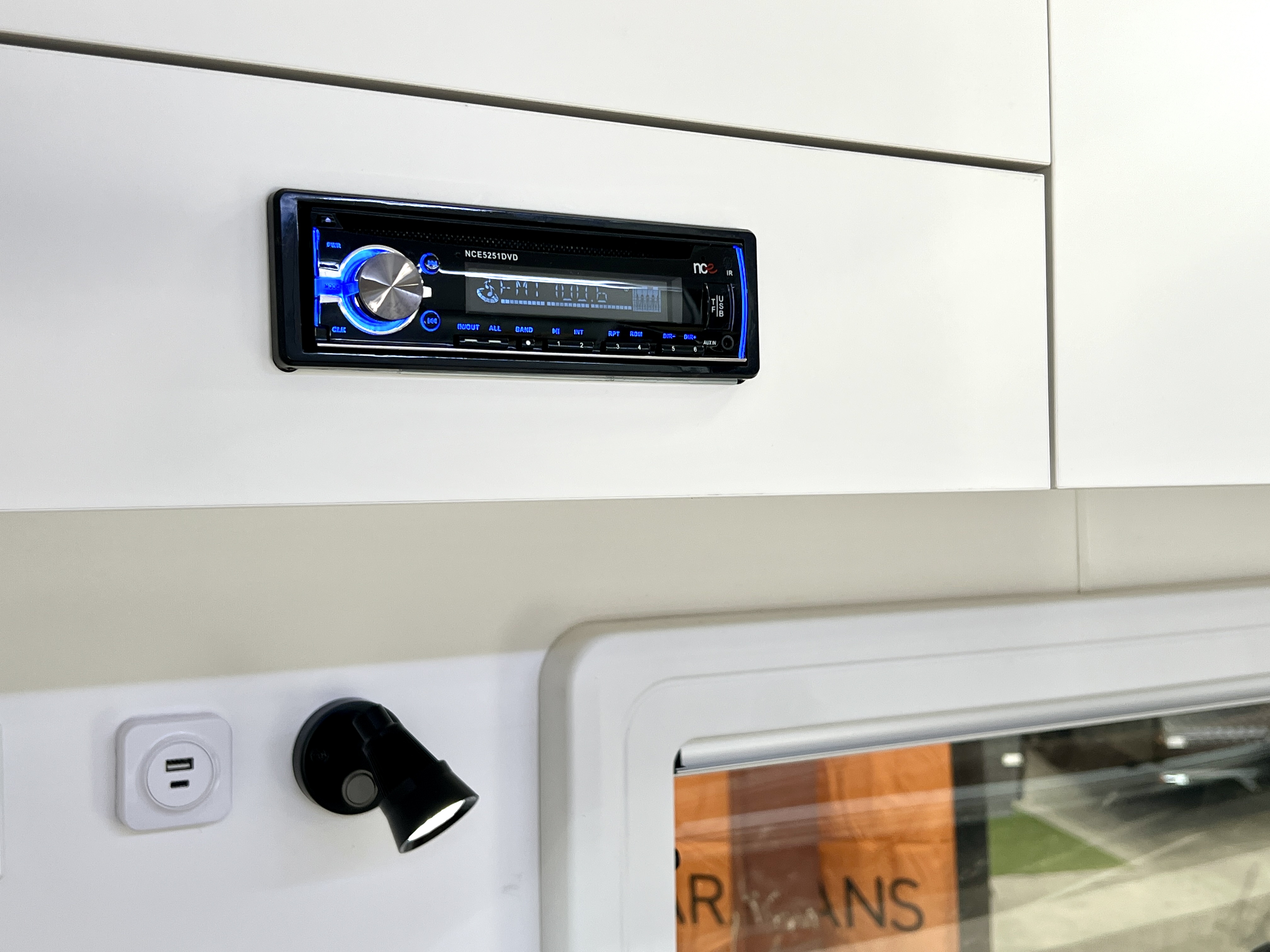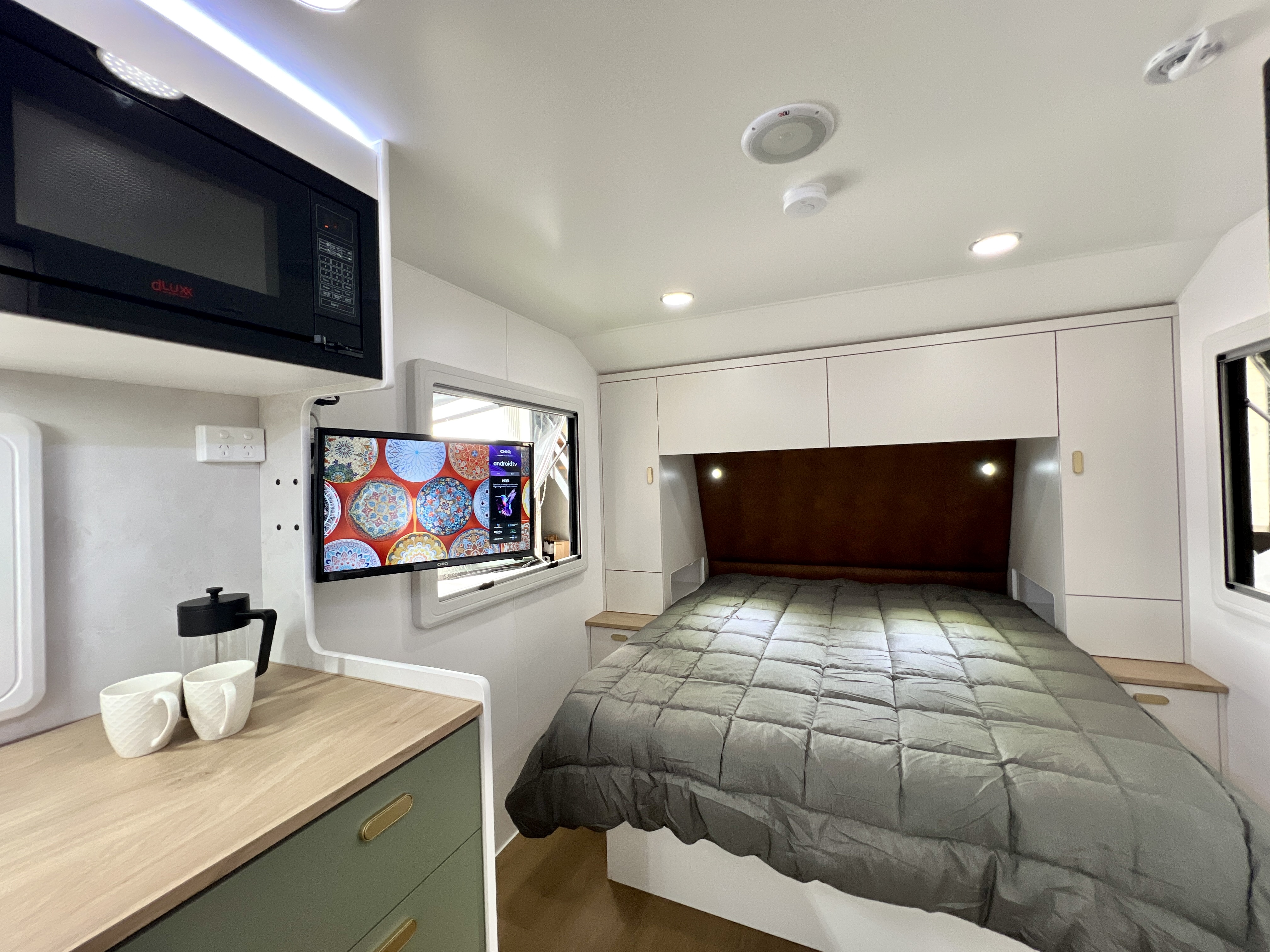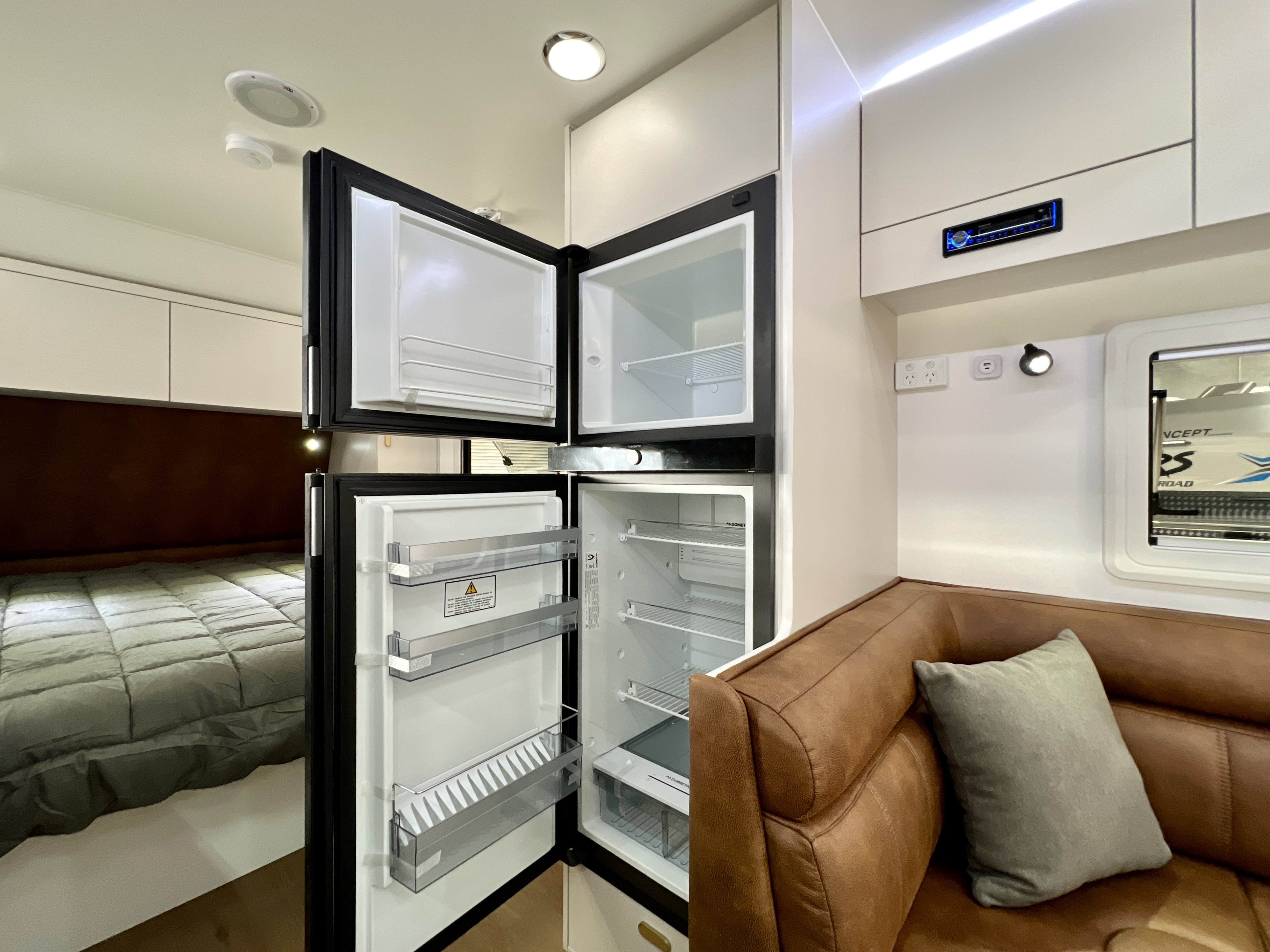 This brilliant, spacious 20’6″ model’s layout features the front Queen Island bed, full rear ensuite and central club lounge opposite the kitchen. A telescopic dining table drops down to make another berth.