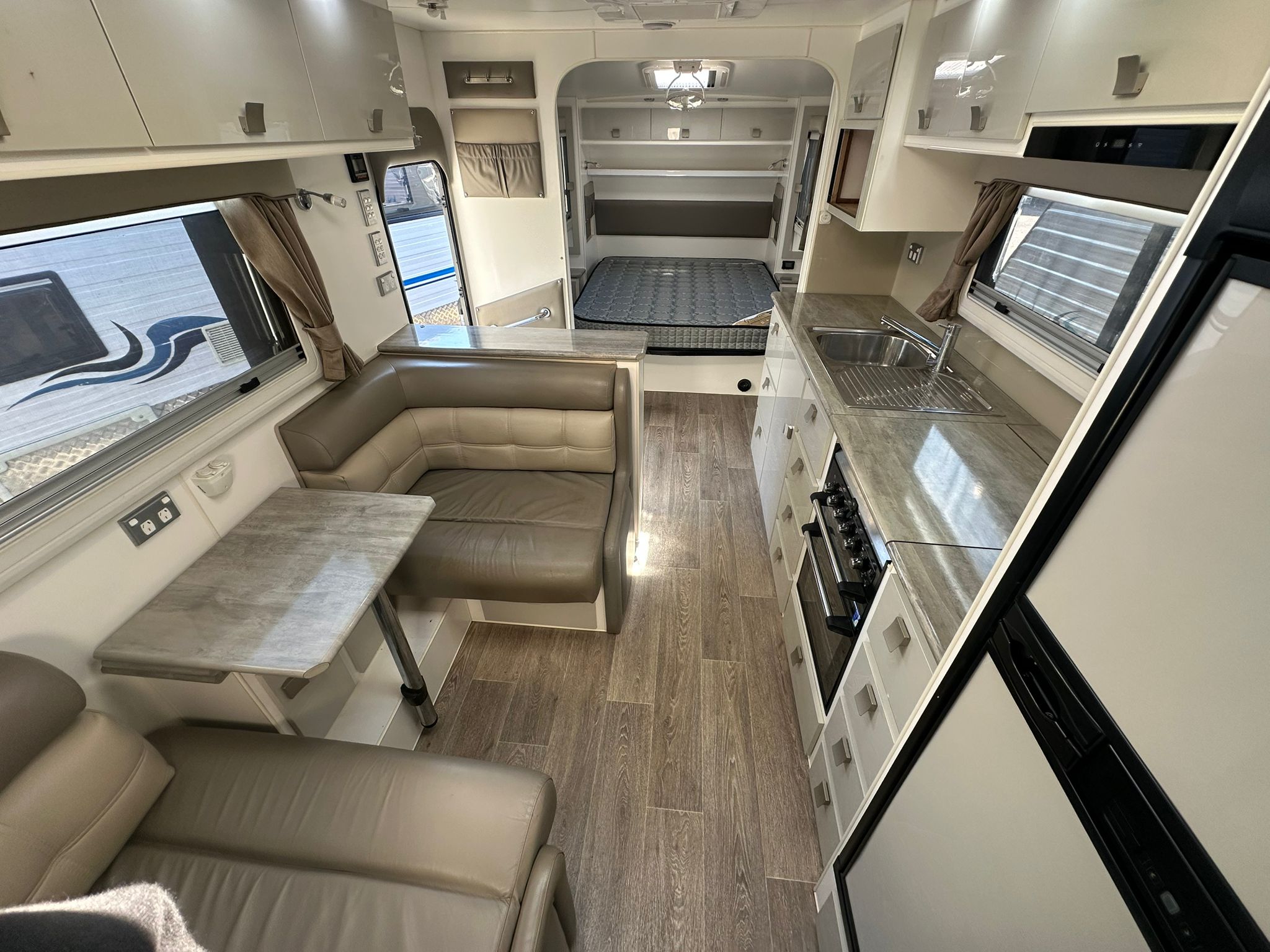 Tough and spacious Island Star Oasis 22ft Semi Off-Roader. Island Star are a well-known Australian manufacturer who have been building caravans since the early 80’s. This Oasis model has the big front bedroom which closes off with a concertina door, cafe dinette opposite the kitchen and a big rear ensuite bathroom.